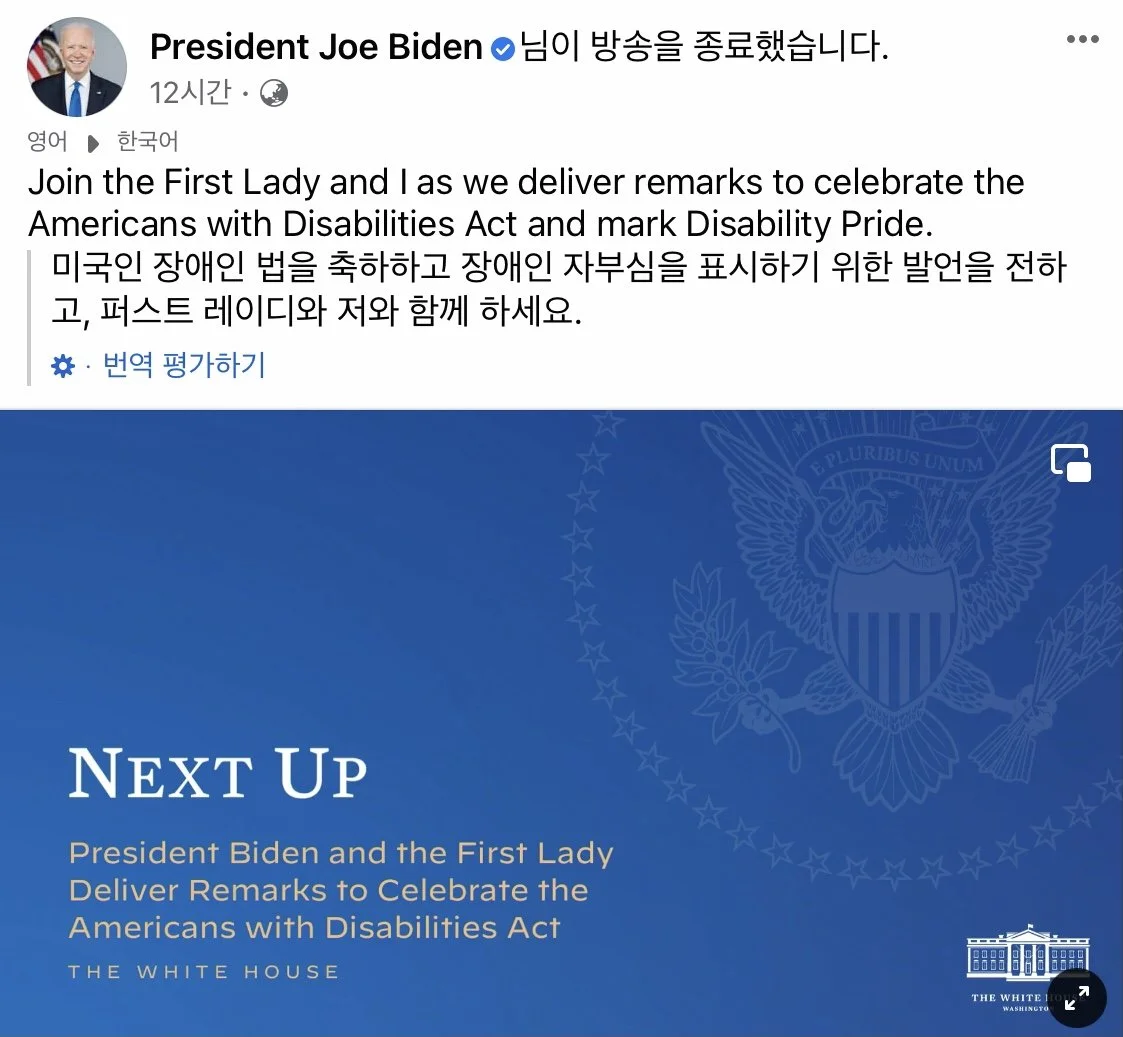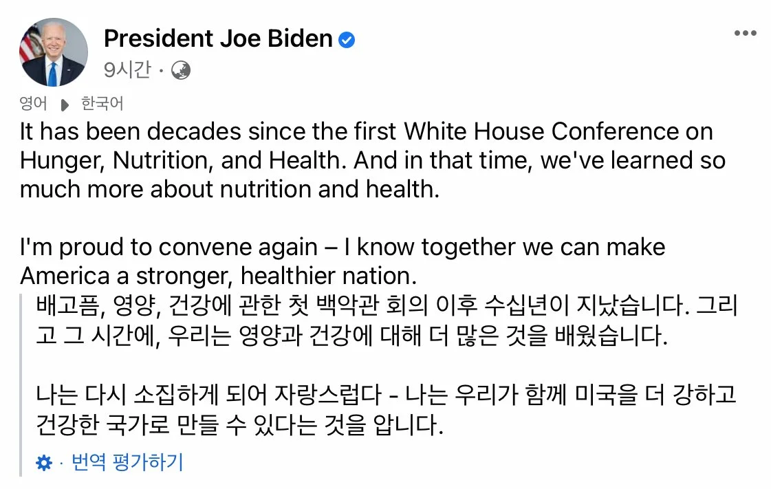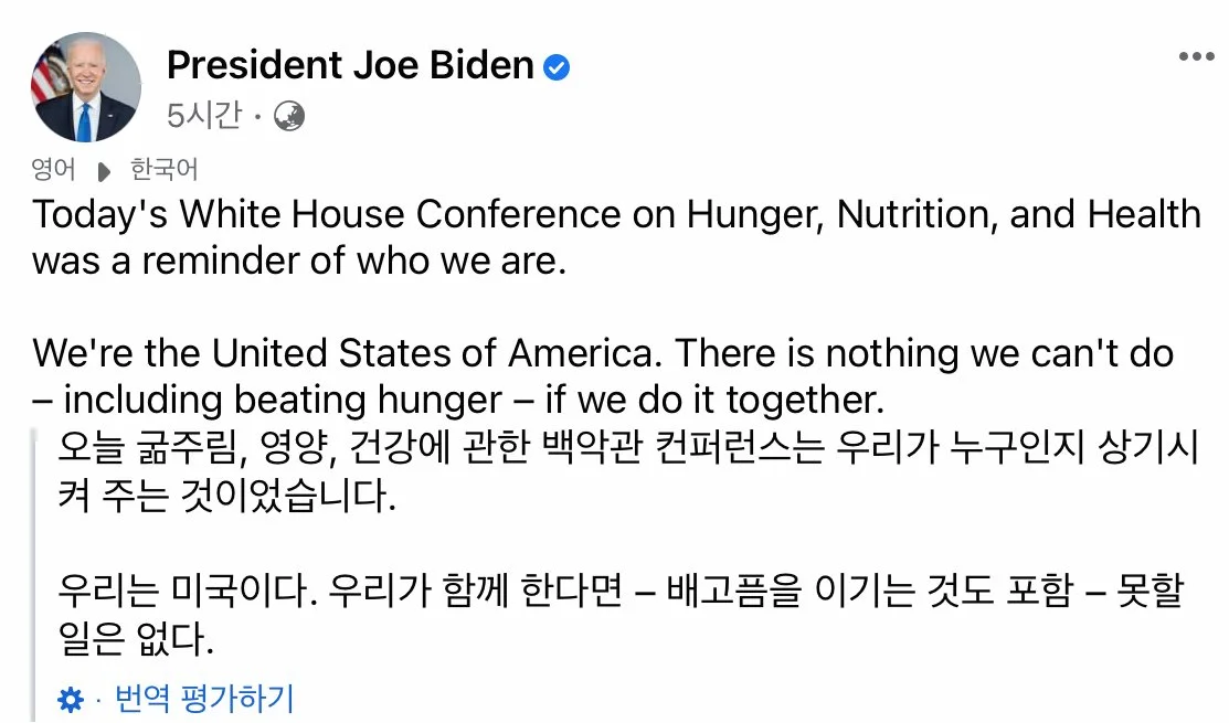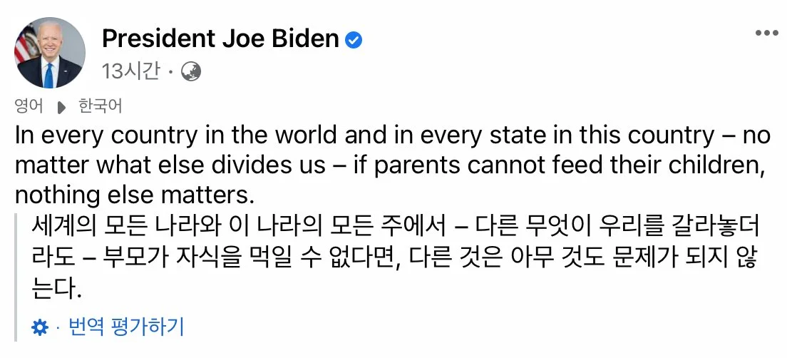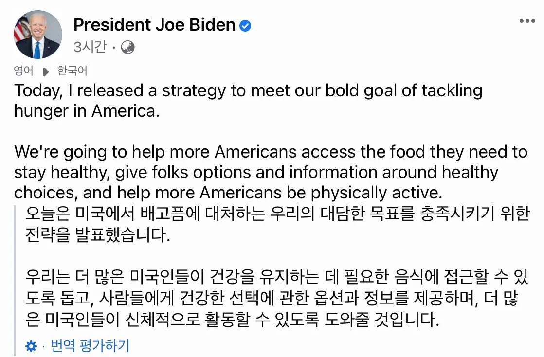 미국 대통령 조 바이든의 지난 하루 동안 페이스북 계정에 포스팅한 10건의 글(10건 모두 약자 응원글)